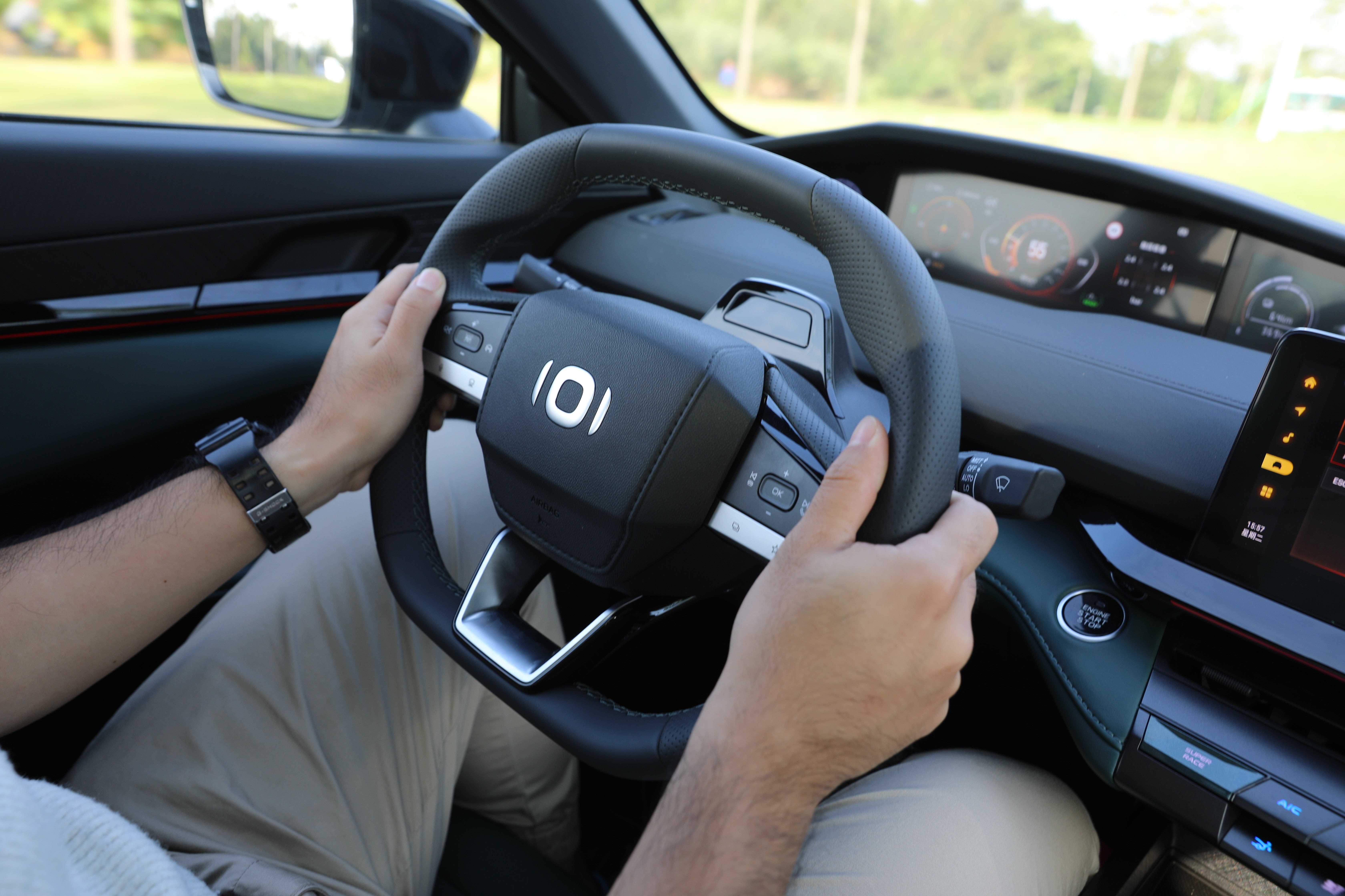 智能驅(qū)動(dòng)模式能夠幫助車輛在不同電量狀態(tài)下,以最優(yōu)的驅(qū)動(dòng)結(jié)構(gòu)對(duì)動(dòng)力進(jìn)行分配,而當(dāng)筆者啟動(dòng)SUPER RACE模式,首先映入眼簾的是儀表盤、中控屏切換到更激進(jìn)的界面UI,其次,車輛的動(dòng)力進(jìn)入到嚴(yán)陣以待的狀態(tài),油門響應(yīng)更為積極,配合模擬聲浪,整車的運(yùn)動(dòng)氣質(zhì)完全展現(xiàn)出來(lái)。